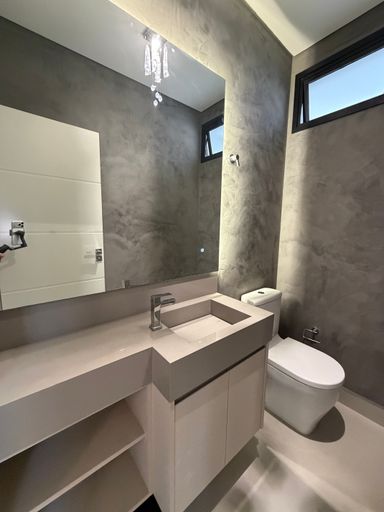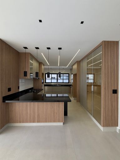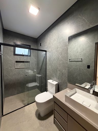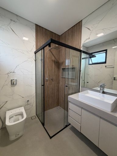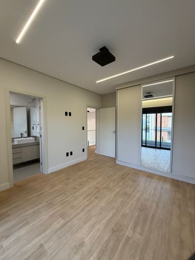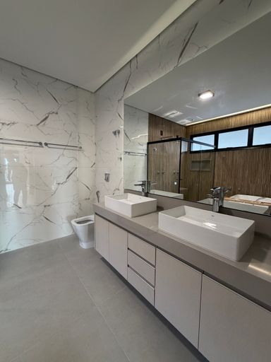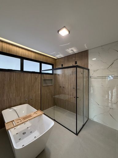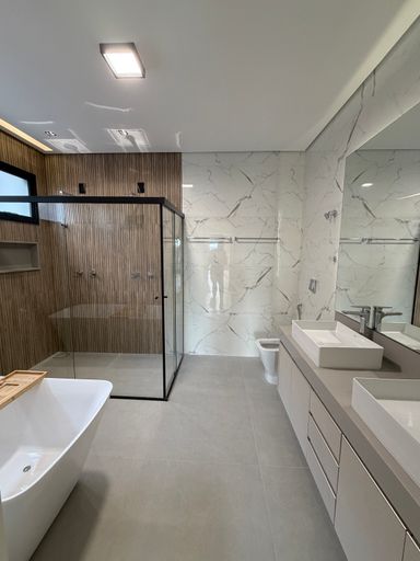 • 4 suítes, sendo 01 master com cuba e chuveiro duplos, Banheira de Imersão e Closet , todas com marcenaria completa e ar condicionado
