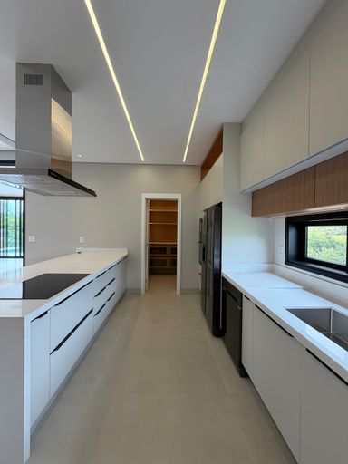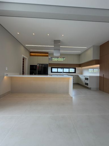 • Cozinha com enorme ilha, toda equipada com eletrodomésticos, geladeira e lava louças